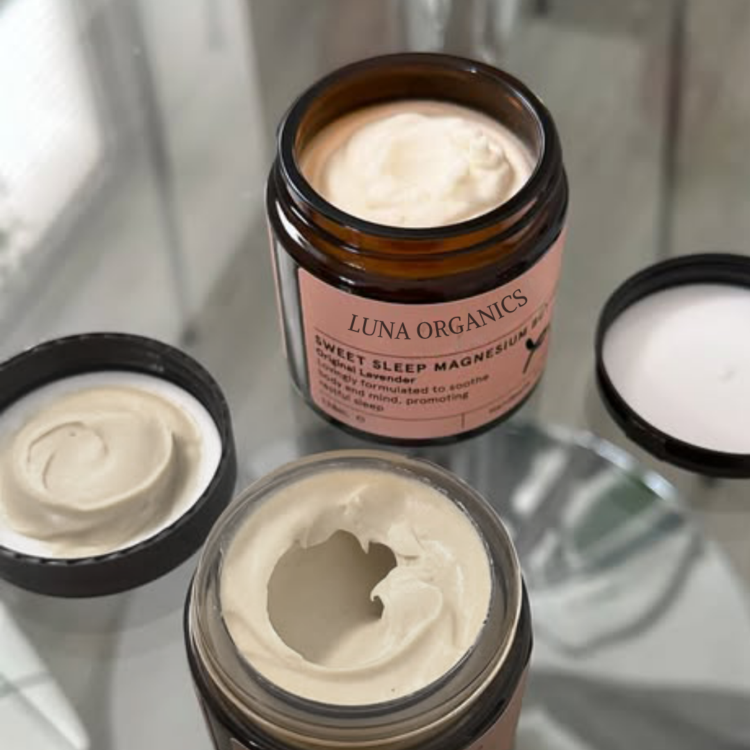 Sweet Sleep Magnesium Butter is our bestselling magnesium-rich body butter that promotes better sleep and soothes various discomforts. Key benefits include: improved sleep quality, calming restless legs and muscle cramps, soothing migraines, reducing anxiety, alleviating menopausal symptoms, and providing natural, hormone-free relief.